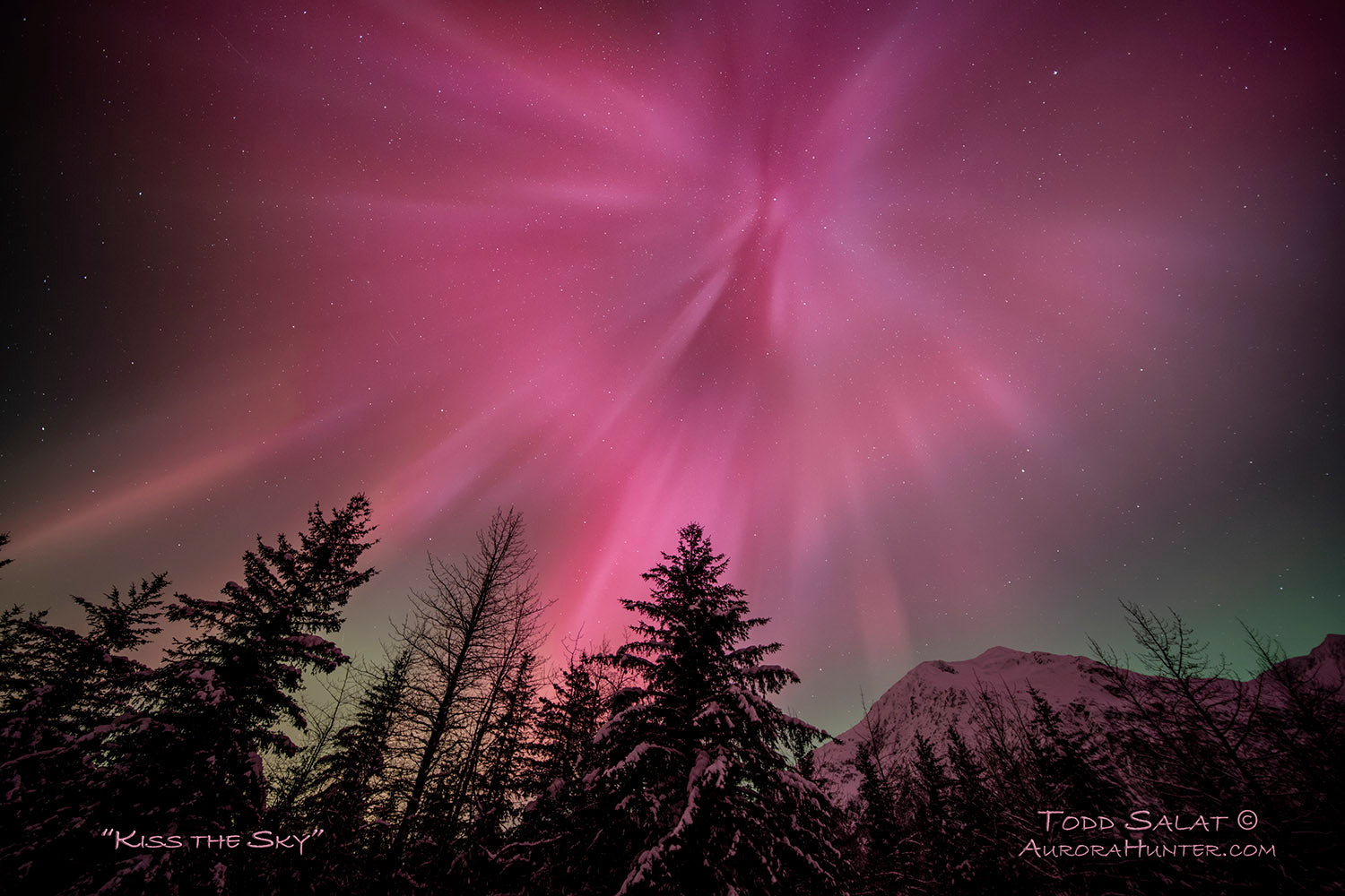Hot pink auroras radiate over Portage Valley, Alaska during the Veterans Day show of November 11, 2025 at an unbelievably early 6:40 pm